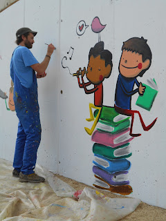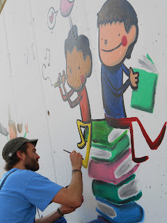 En Joan Turu és un pintor molt reconegut en l'àmbit de l'educació i en d'altres. Avui ha passat tota la jornada amb nosaltres pintant un mural al pati juntament amb els alumnes grans de l'escola. En dues ocasions hem baixat a veure l'evolució d'aquest dibuix i hem pogut gaudir d'una estona amb ell. Gràcies Joan per la feina feta!